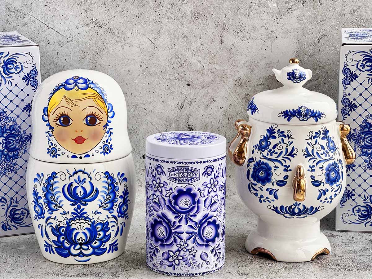В ассортименте GET&JOY также представлены подарки, выполненные в стиле росписи Гжель.